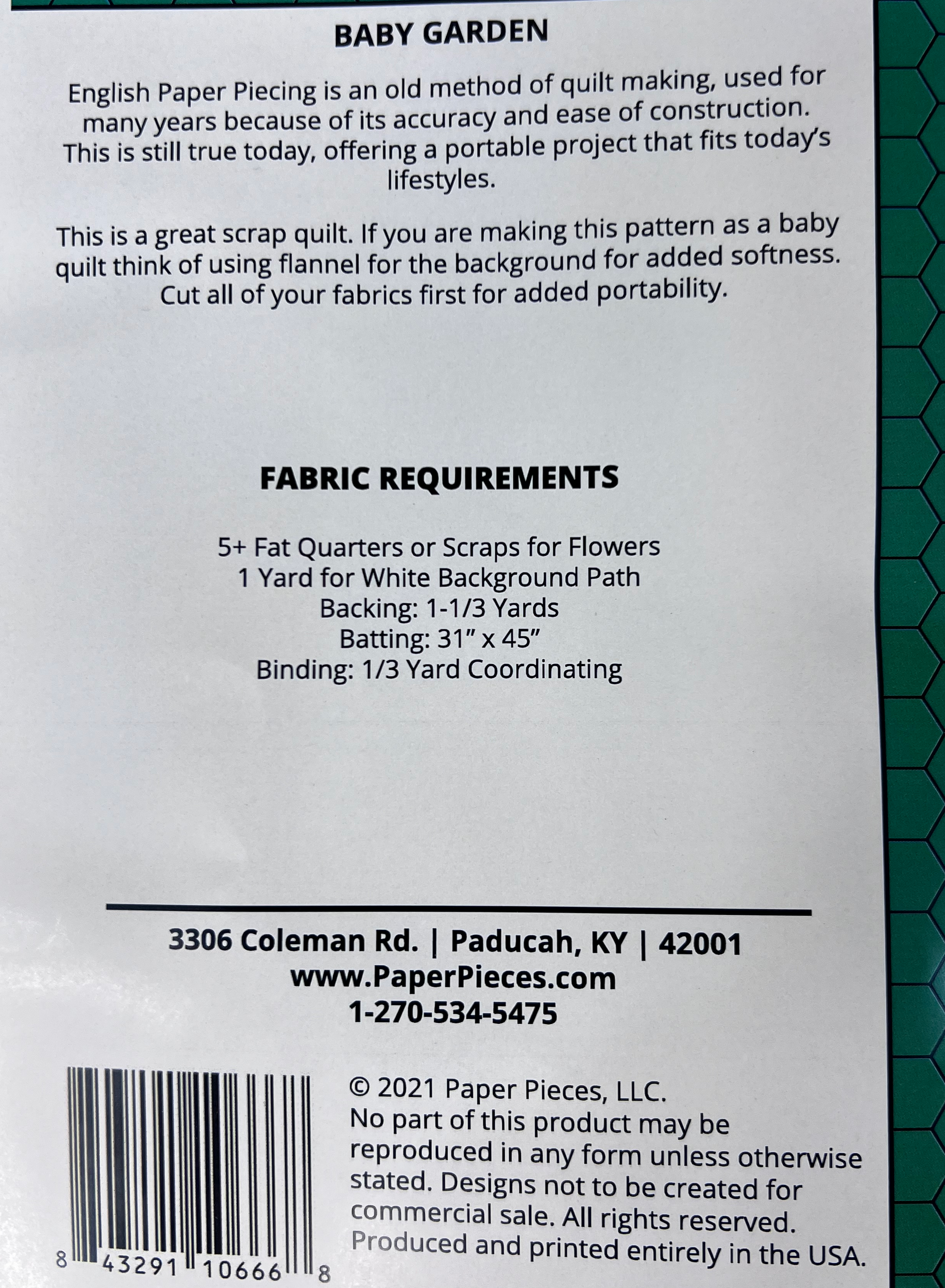 This is a great scrap buster for all EPP enthusiasts! The finished size is 27" x 40 1/2" and makes a great crib sized quilt. Use up your scraps with this pretty spin on the traditional Grandmother's Flower Garden pattern.