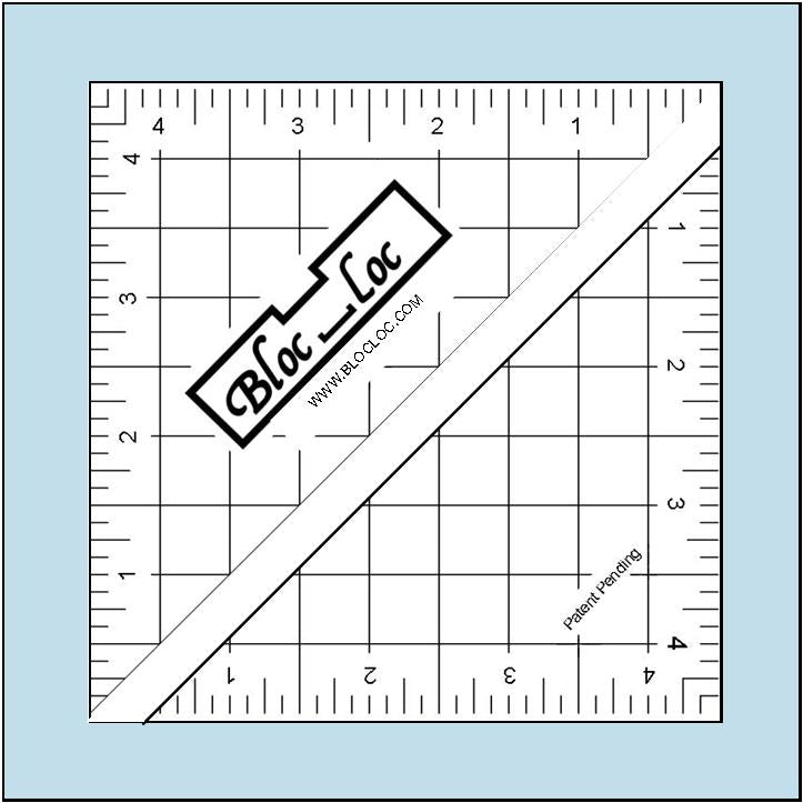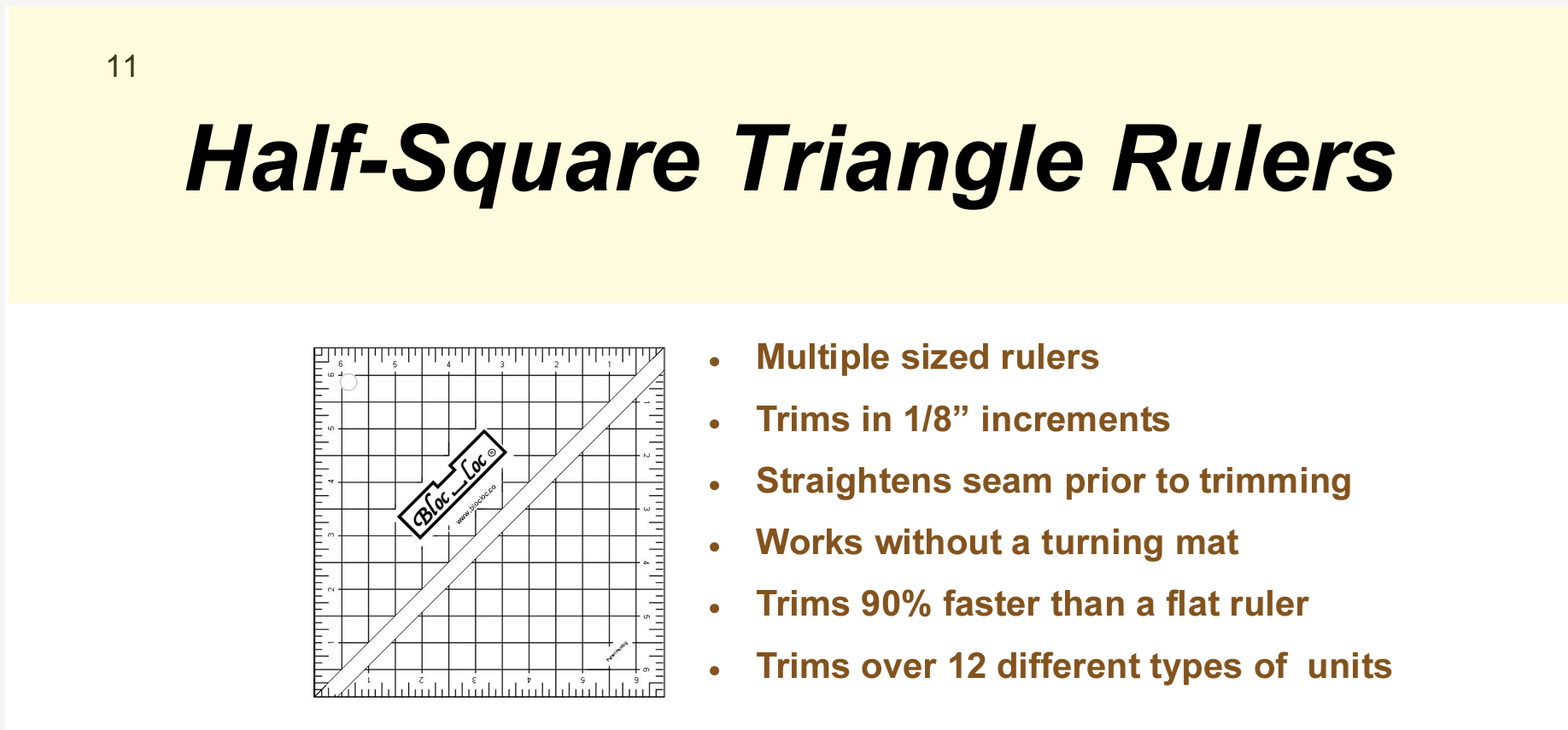 Bloc Loc Half-Square Triangle Rulers (HST) can trim multiple sizes of units in 1/8″ increments. The groove locks onto the seam for instant ruler placement and straightens the seams in the corners. Trims 90% faster than a flat ruler and the ruler rocking is gone.