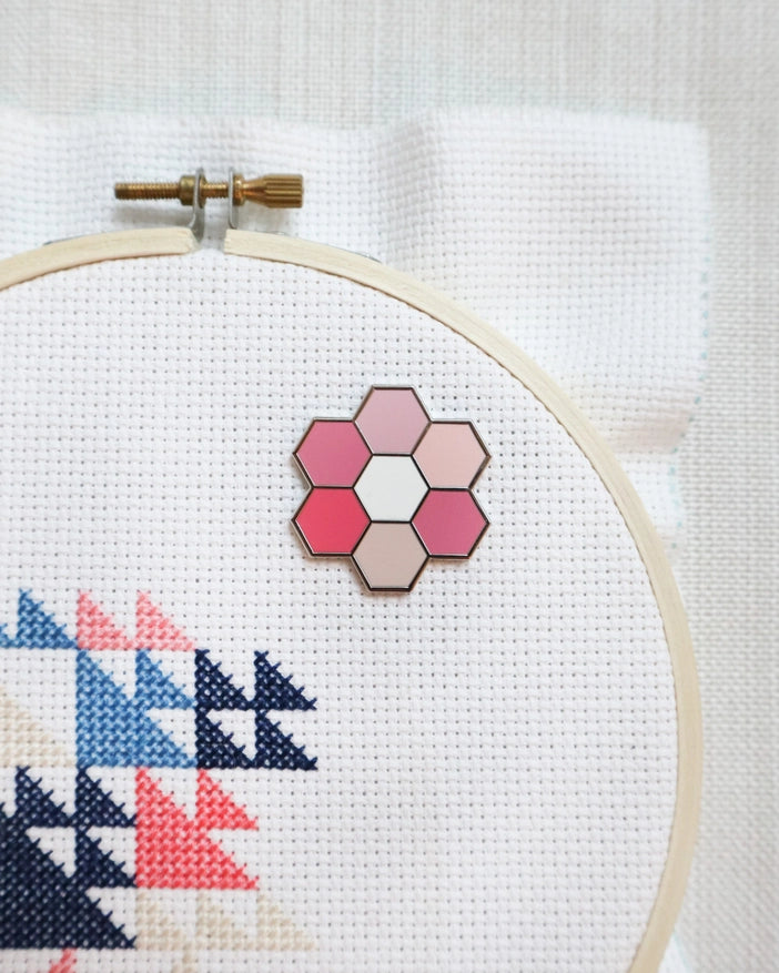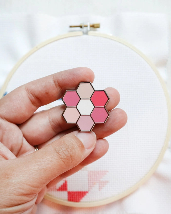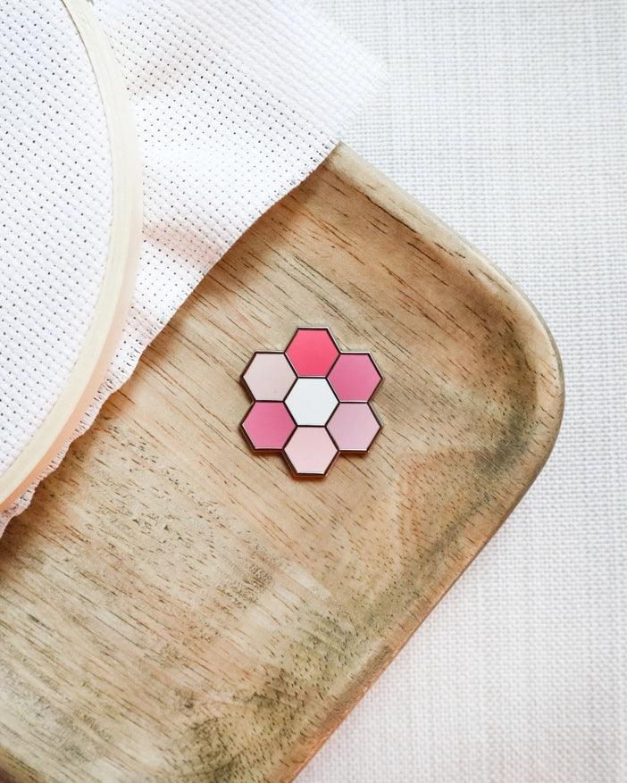 Say goodbye to needle drops and unwanted holes in your fabric with this needle minder inspired by the popular Hexie Blooms quilt pattern. Its magnetic back will keep your needle safe and easy to locate during all your needlework endeavors.