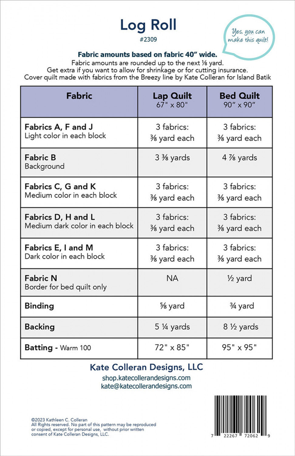 Log cabin quilts are iconic and very versatile. Log Roll features a modern take on the log cabin block and the use of multiple fabrics in gradations of one color let the rows of blocks really shine! A great advanced beginner quilt! Pattern includes 2 sizes: a generous lap quilt at 67" x 80" and a bed quilt at 90" x 90".