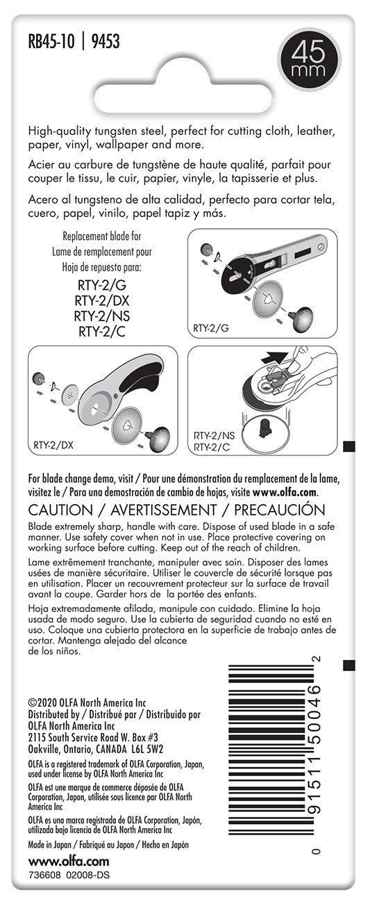 Ten circular rotary replacement blades for our popular 45mm rotary cutters used for quilting, sewing, and general crafts. Cuts up to 6 layers of fabric. These blades are made of high quality tungsten steel for unparalleled sharpness and superior edge retention. For Original 45mm Rotary Cutter (RTY2), Deluxe 45mm Rotary Cutter (RTY2DX) and Quick-Change Rotary Cutter (RTY2NS).