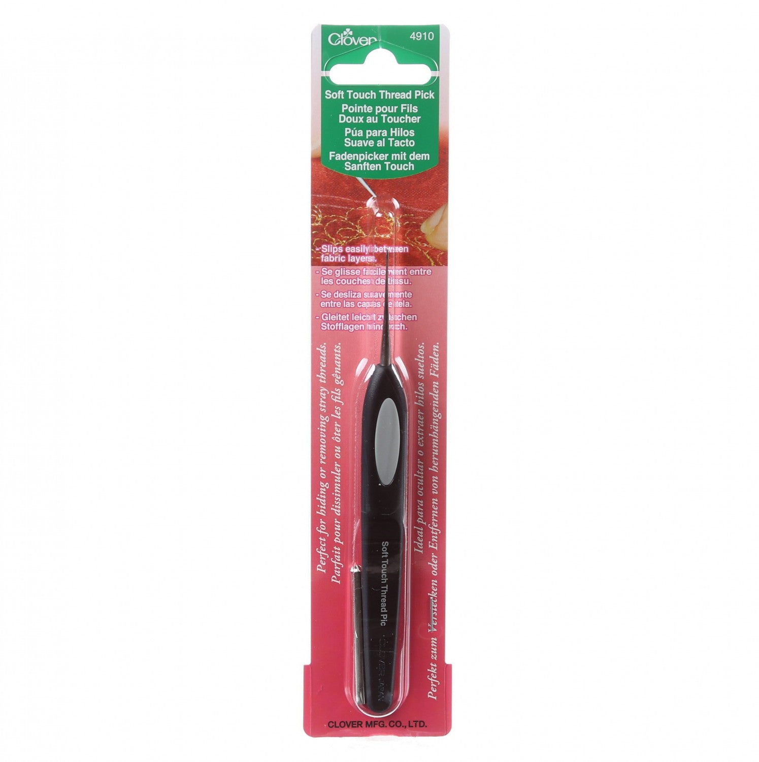 The soft touch thread pick hides broken threads. Pull threads to the inside of the project, never to be seen again! Remove unwanted stray threads caught between the top and batting. Correct mistakes in corners. Use to hold your project in place while stitching. Push edges for quick turn applique projects. In surging, use to hide serger tails in the seam. Easily repair snags in sweaters and knitted items.